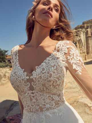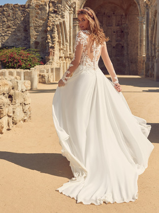 Presenting the muse of illusion, the icon of demure romance, the portrait of elegance and sophistication. Chantal Lynette from Maggie Sottero is a boho wedding dress crafted from layers of lace and the softest chiffon.