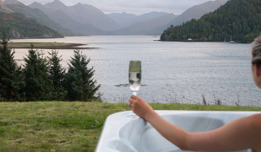 Unveil Scotland's iconic landscapes from Ardelve, where Three Lochs View presents an uninterrupted panorama of mountain peaks and Eilean Donan Castle. Romantic evenings in the hot tub under starlit skies make for perfect honeymoon memories. Discover here.
